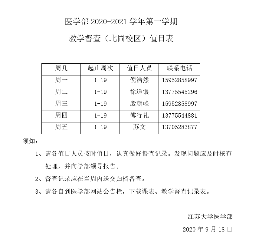 医学部2020-2021学年第一学期教学督查(北固校区)值日表