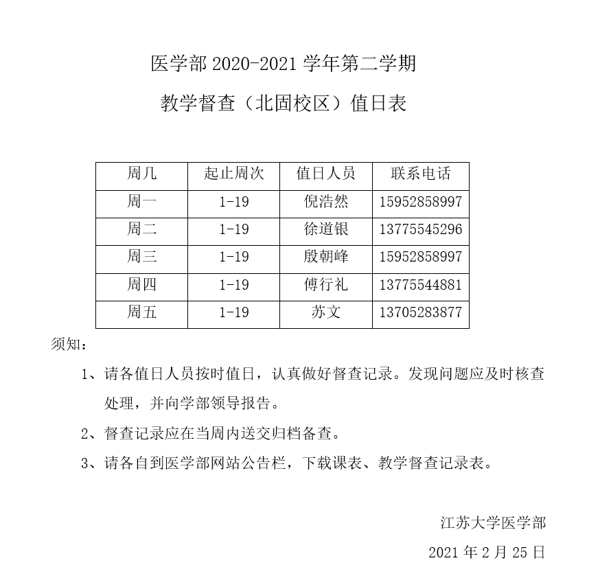 医学部2020-2021学年第二学期教学督查(北固校区)值日表